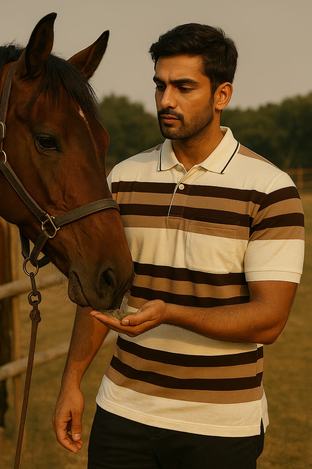 Presenting a timeless and stylish polo t-shirt designed for effortless sophistication. This beige polo features bold horizontal stripes in chocolate brown, adding a contemporary edge to the classic silhouette. Crafted from comfortable, breathable fabric, it boasts a neat collar with contrast piping, a single chest pocket, and a well-tailored fit—perfect for both casual outings and relaxed evenings by the beach. The soft, lightweight knit ensures all-day comfort, while the modern stripe pattern brings a fresh update to your everyday wardrobe. Ideal for men who appreciate both comfort and standout style in versatile, smart-casual attire.