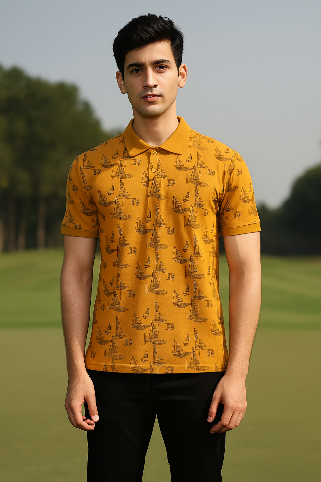 Add a touch of effortless charm to your everyday style with this mustard yellow printed polo t-shirt from Exquiso. Crafted from premium cotton-rich fabric, it ensures superior comfort and breathability all day long. The t-shirt features an all-over sailboat print that adds a fun and refreshing vibe — perfect for weekend getaways, casual Fridays, or evening outings.